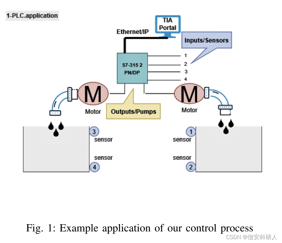 PLC读取来自传感器1、2、3和4的输入信号。当水箱充满水时,安装在两个水箱上的两个上部传感器 (Num. 1,3) 向设备报告,而当水箱为空时,两个下部传感器 (Num. 2,4) 向设备报告。然后,PLC根据接收到的传感器读数为泵提供电源,放水至水箱。