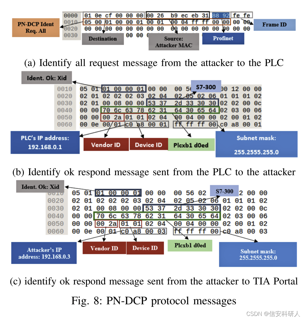 做法: 在旧会话期间记录了TIA门户和远程PLC之间的 “identify all” 和 “identify ok” 数据包,然后修改了真实PLC的响应数据包,将PLC的ip地址替换为192.168.0.1与假PLC的ip地址192.168.0.3。