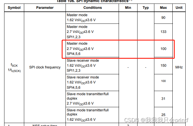 H7的SPI4的主机模式最高频率为100MHz,这里分频最小二分频,也就是实际通信速率50Mbps,为什么我们通过设置最大频率直接设置?