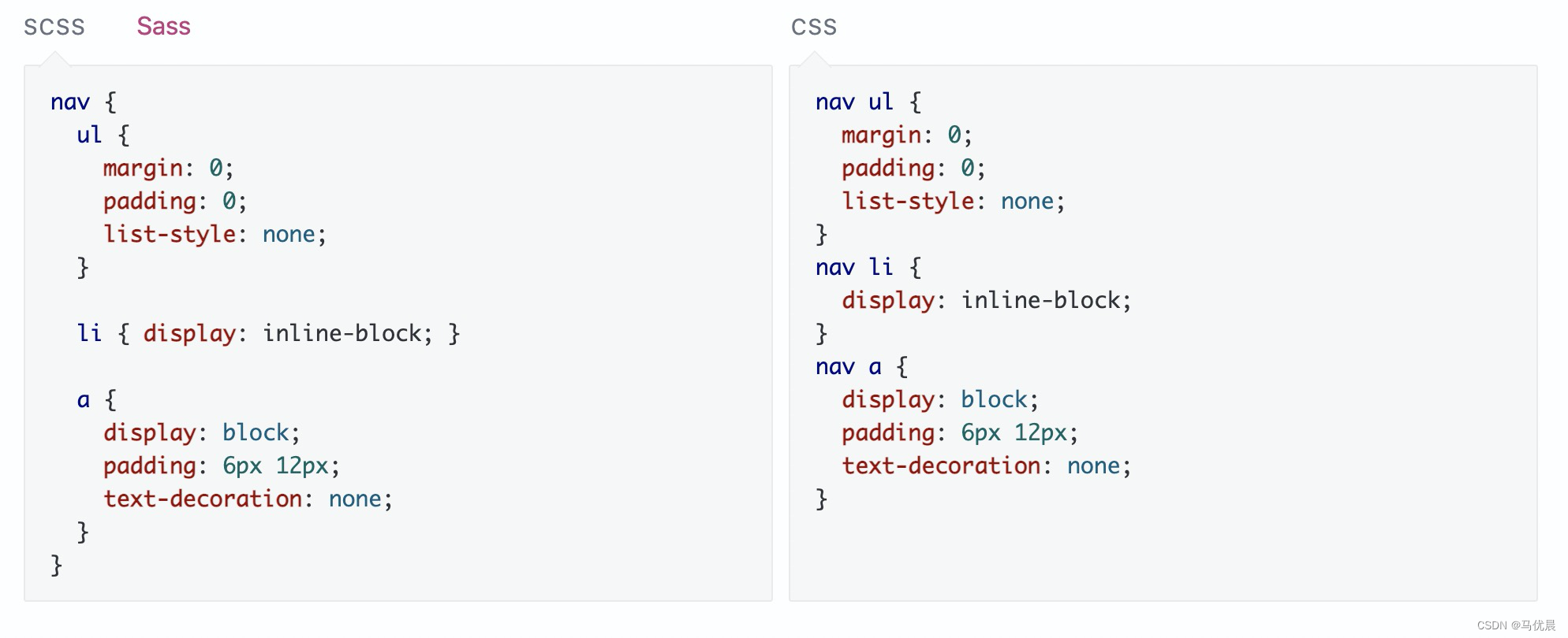 Sass 允许您嵌套 CSS 选择器,嵌套方式 与 HTML 的视觉层次结构相同。请注意,过度嵌套的规则 将导致过度限定的 CSS,这些 CSS 可能很难维护,并且 通常被认为是不好的做法。