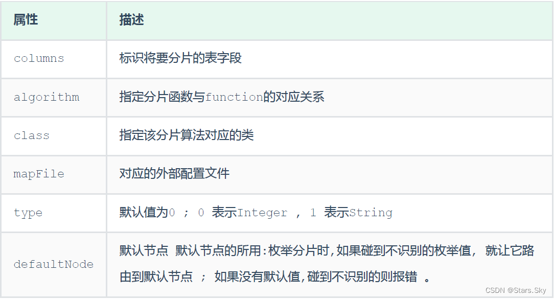 含义:0-500万之间的值,存储在0号数据节点(数据节点的索引从0开始) ; 500万-1000万之间的数据存储在1号数据节点 ; 1000万-1500万的数据节点存储在2号节点 ;该分片规则,主要是针对于数字类型的字段适用。