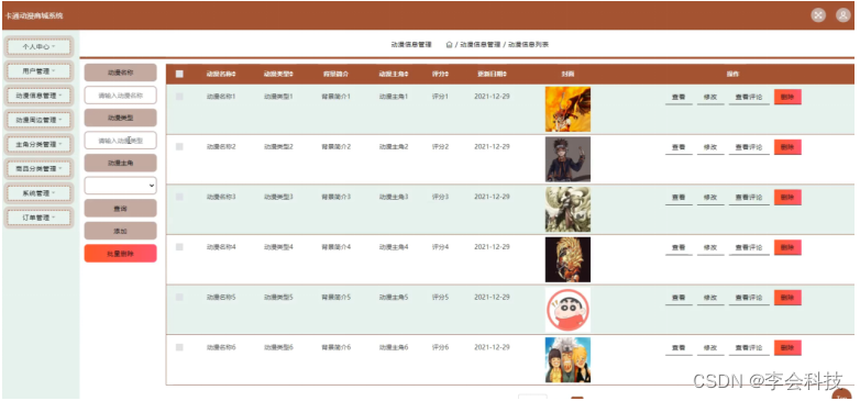 动漫信息管理,在动漫信息管理页面可以对动漫名称、动漫类型、背景简介、动漫主角、评分、更新日期、封面等内容进行查看、查看评论、修改或删除等操作,如图5-9所示。