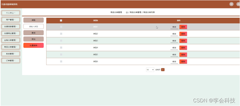 商品分类管理,在商品分类管理页面可以对类型等内容进行修改或删除等操作,如图5-12所示。