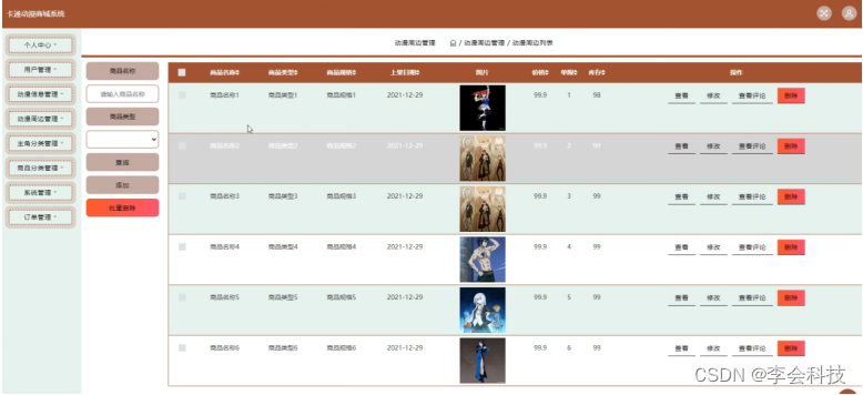 动漫周边管理,在动漫周边管理页面可以对商品名称、商品类型、商品规格、上架日期、图片、价格、单限、库存等内容进行查看、查看评论、修改或删除等操作,如图5-10所示。