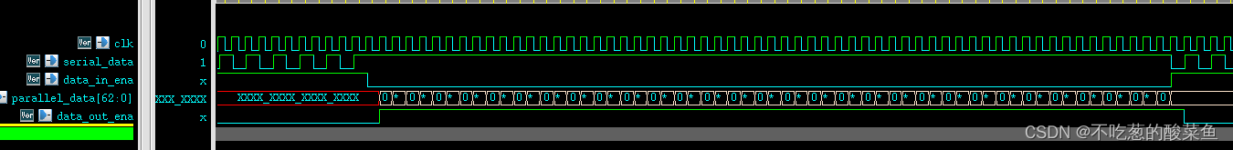 支持背靠背传输,3780周期输入单bit数据,之后输入有效信号拉低60周期,此时输出有效信号拉高,输出60周期63bit的并行数据。
