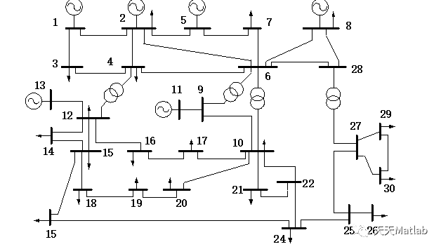 校验程序的算例基于IEEE-30节点标准测试系统,系统接线图如图1。系统包含30个节点,6台发电机组。要求确定系统最优机组组合,使得系统各机组总运行成本(煤耗成本+启停成本)最小化。