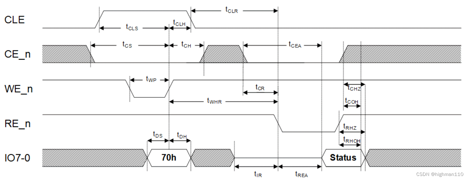 相当于一段命令锁存时序,一段数据输出时序。在写使能上升沿将读状态命令70h锁存,经过一段时间后将状态寄存器SR的值输出到IO上。