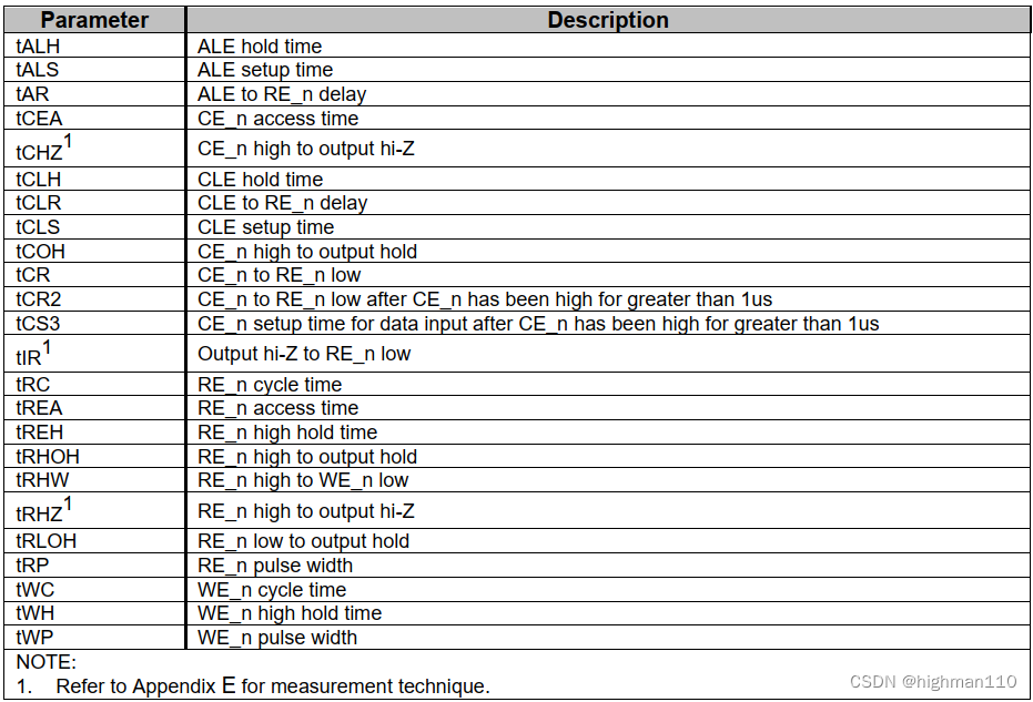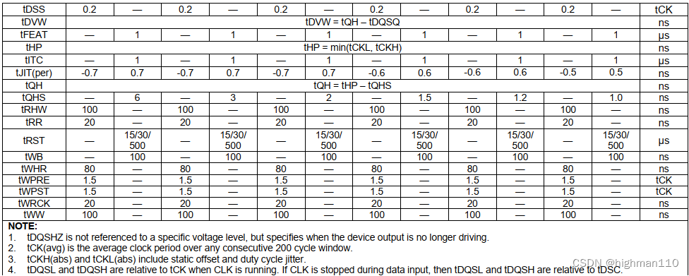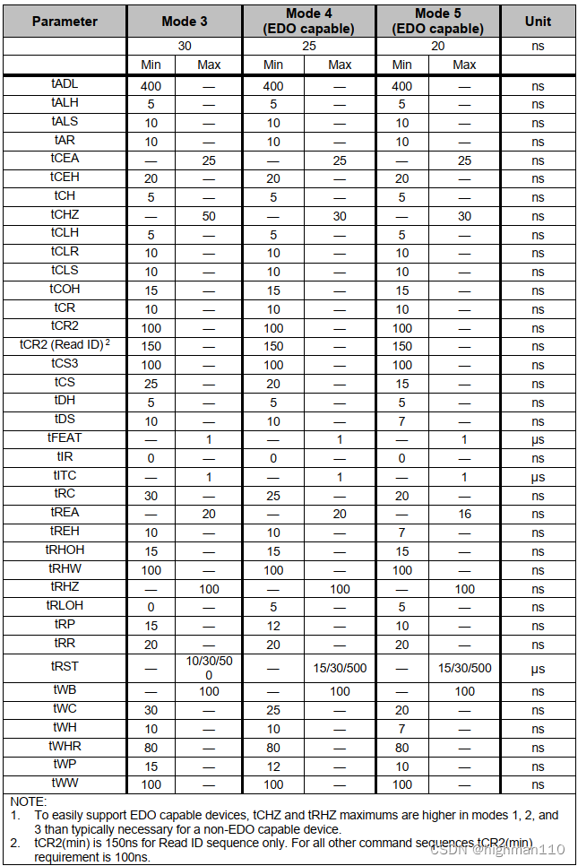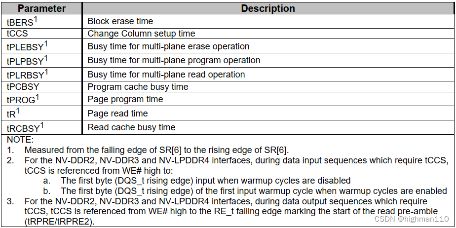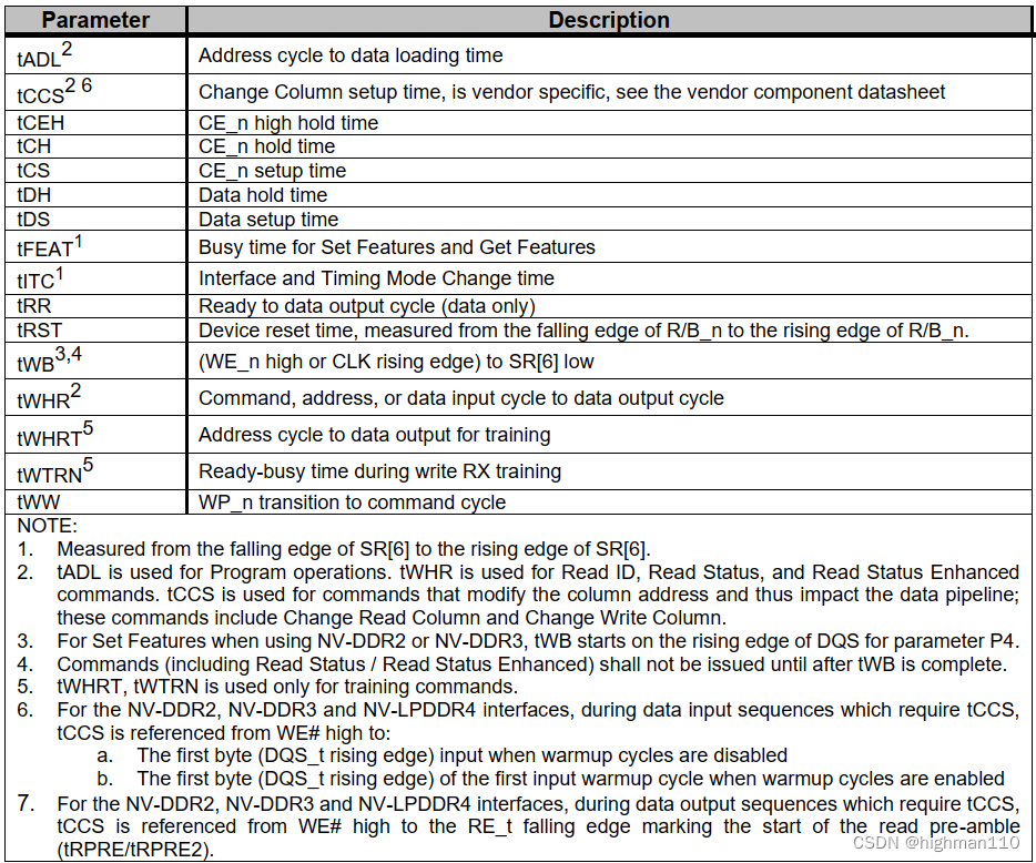 下表为SDR、NV-DDR、NV-DDR2、NV-DDR3、NV-LPDDR4共有的时序参数: