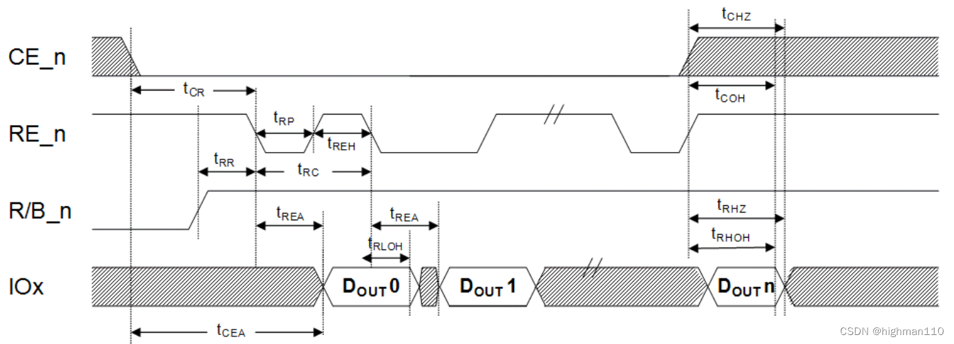 在CLE、ALE、片选为低时,数据在读使能信号的下降沿延迟一段时间后输出到IO上。