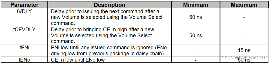 CE_n引脚减少机制可能被用于任何接口中。 如果 VccQ=3.3V 或 1.8V,则 CE_n 引脚reduction的配置应该使用 SDR 接口完成。如果 VccQ=1.2V, CE_n 引reduction 的配置应该使用 NV-DDR3 接口完成。在封装内的 daisy chain使用的enumeration信号时序以及 Volume 寻址的时序参数如下表所示。