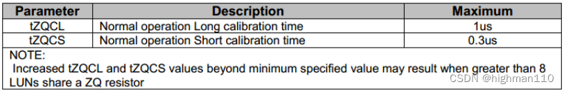 ZQ校准的时序参数如下表,SDR和NV-DDR没有ZQ校准: