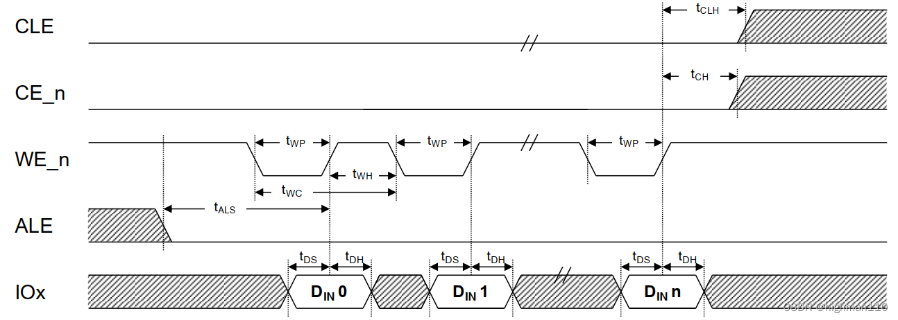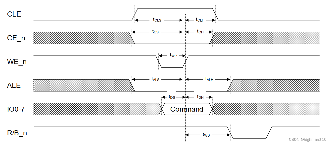 命令锁存是在CLE为高、ALE为低时,在WE_n的上升沿锁存IO引脚上的命令值。时序图如下: