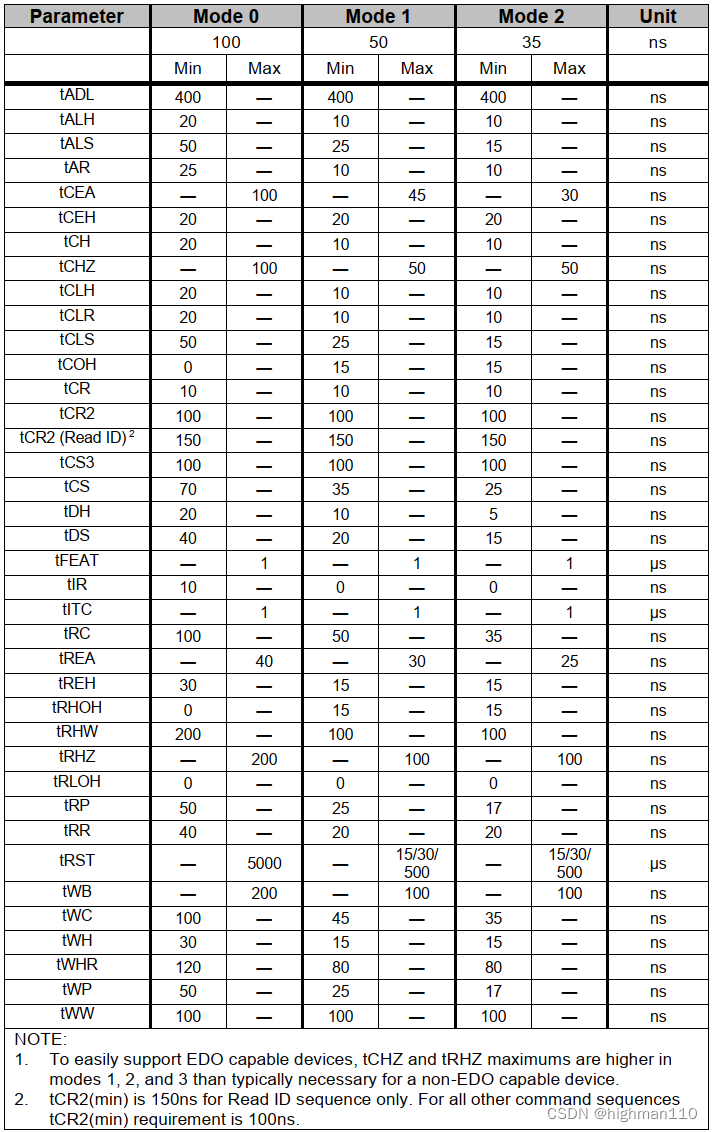ONFI协议中明确规定了时序参数的范围,如果不满足要求的最小和最大时序参数时,闪存设备的行为是不确定的。SDR、NV-DDR接口模式下有6种时序,NV-DDR2、NV-DDR3、NV-LPDDR4有22种时序模式,上电后闪存设备处于模式0状态下,闪存设备可以不支持所有时序模式,判断设备是否支持更高时序模式的方法是通过读取闪存的参数页。
