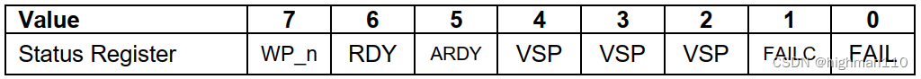 | FAIL | 如果为1,则表示上一个命令失败。如果为 0,表示上一个命令成功。对于raw NAND操作,该位只在编程或擦除操作时有效。对于EZ NAND操作,该位在读、编程以及擦除操作中有效。在program cache操作期间,该位仅当 ARDY 为1时有效。在支持ZQ 校正的device中,如果ZQ校正失败,则该位被设为1。 |