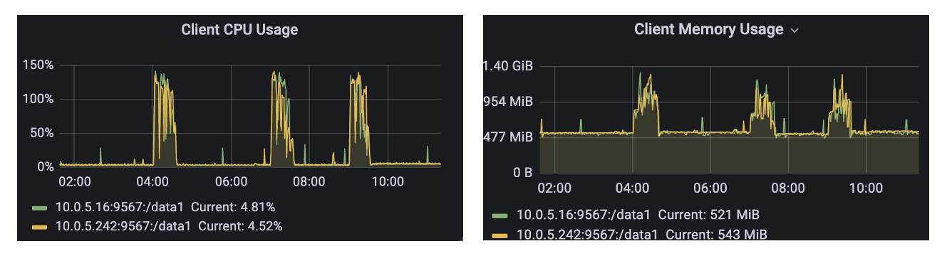 JuiceFS 内存占用通常会在几百 MB,它在高峰期调用的时候会在不到 1.5G 以及它的 CPU 的占用,表现无异常。