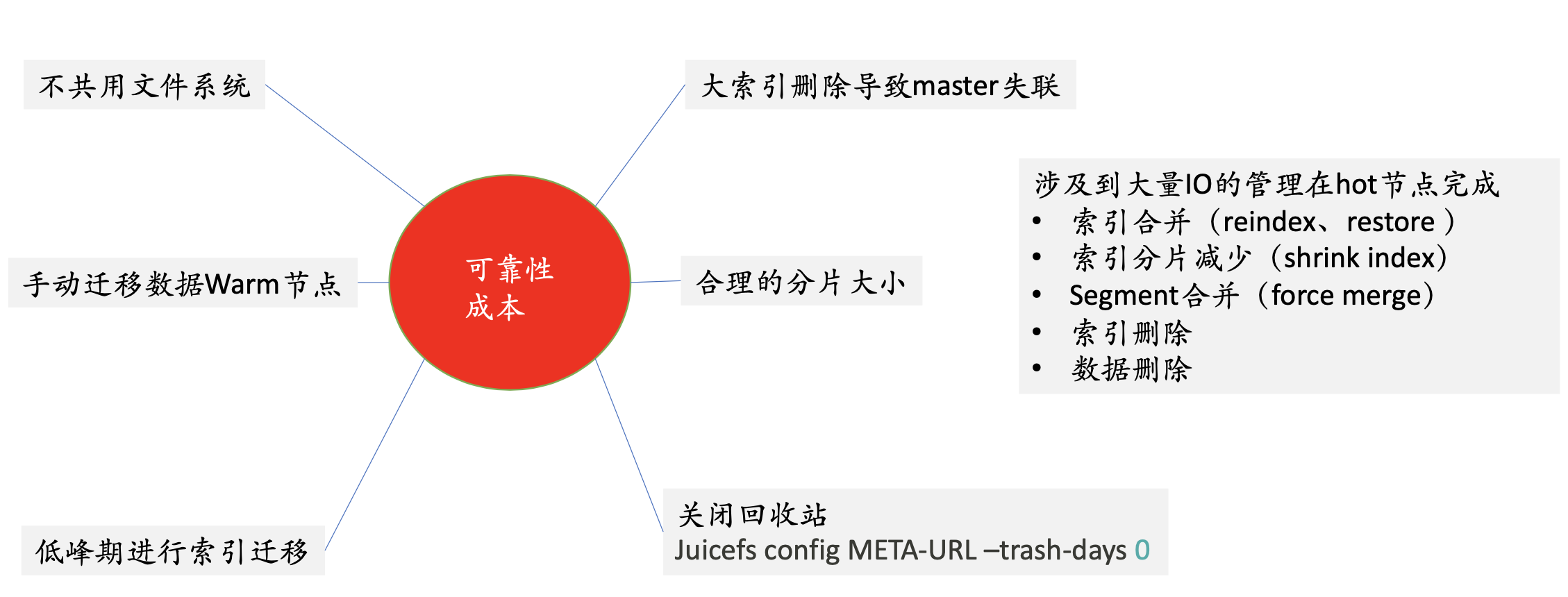 还有一些其他涉及到一些大量 IO 的操作,要在 hot 节点完成。比如索引的合并、快照的恢复、以及分片的减少、索引以及数据的删除等,这些操作如果发生在冷节点,会导致 master 节点失联。 虽然对象存储成本比较低,但是频繁的 IO 调用成本会升高,对象存储会要按照 put 和 get 的调用次数来收费,因此需要把这些大量的操作来放到热节点上,只供业务侧冷节点来做一些查询。