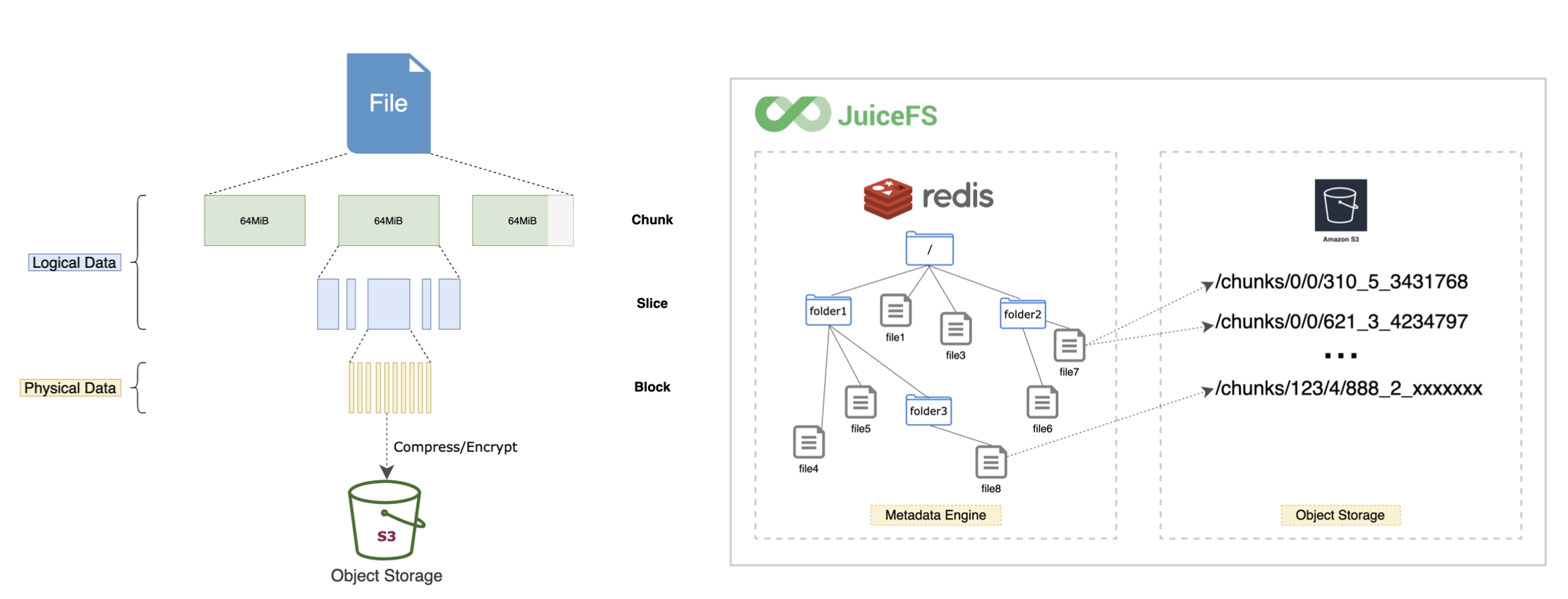JuiceFS 分为三层结构,chunk、slice、block,因此我们在对象存储上面看到的是 JuiceFS 对文件做拆分之后的数据块。但是所有的数据是通过 ES 来管理,所以这一点用户不需要关注,只需要通过 ES 来执行所有的文件系统操作即可。JuiceFS 会恰当管理对象存储中的数据块。