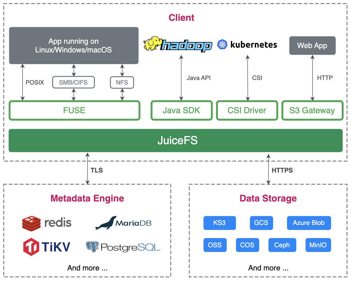 JuiceFS 产品介绍中第一句话就是 “像本地盘一样使用对象存储”,恰恰是我们做 ES 时所需要的功能。JuiceFS 已经集成了很多种对象存储,金山云的 KS3 也已经完整兼容,只需要再选一个元数据库即可。