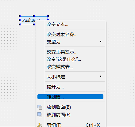 窗口中添加一个QPushButton控件,右键点击该控件,点击转到槽