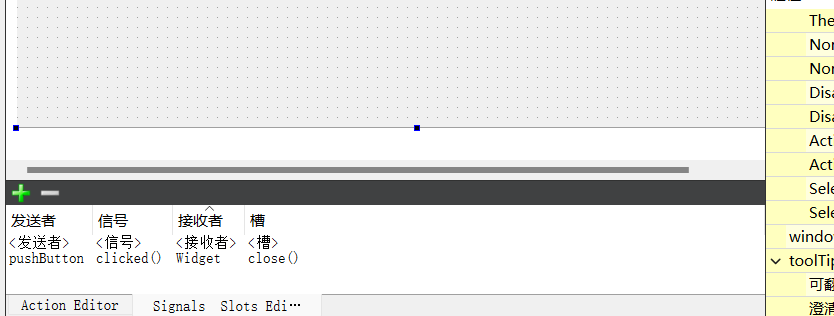 6.窗口的下方为信号和动作列表,可以查看动作和信号和槽列表
