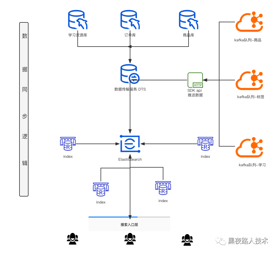 整个数据进入ES索引库中,总体的数据索引构建的主要技术架构: