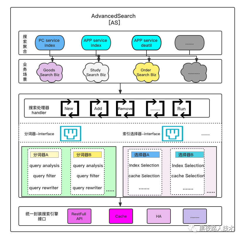反向代理层:基于底层搜索引擎的代理层,包括了:搜索分片,搜索引擎切换,搜索服务降级,底层数据存储切换,搜索数据缓存。代理层都实现了相同的接口比如:搜索数据,推送数据。