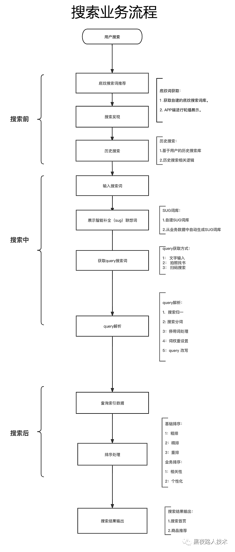 按照整个业务流程、从输入到输出链路,我们看看 输入数据(输入/灌数据、索引构建)、搜索前(搜索发现)、搜索中(查询处理、索引召回、排序)等环节把整个技术落地架构进行描述。