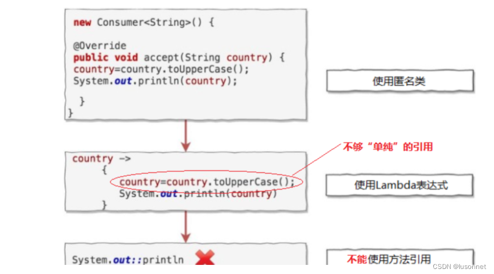其使用有一定的条件:lambada表达式的主体仅包含一个表达式,且lambada表达式只调用一个已经存在的方法;被引用的方法的参数列表与lambada表达式的输入输出一致。