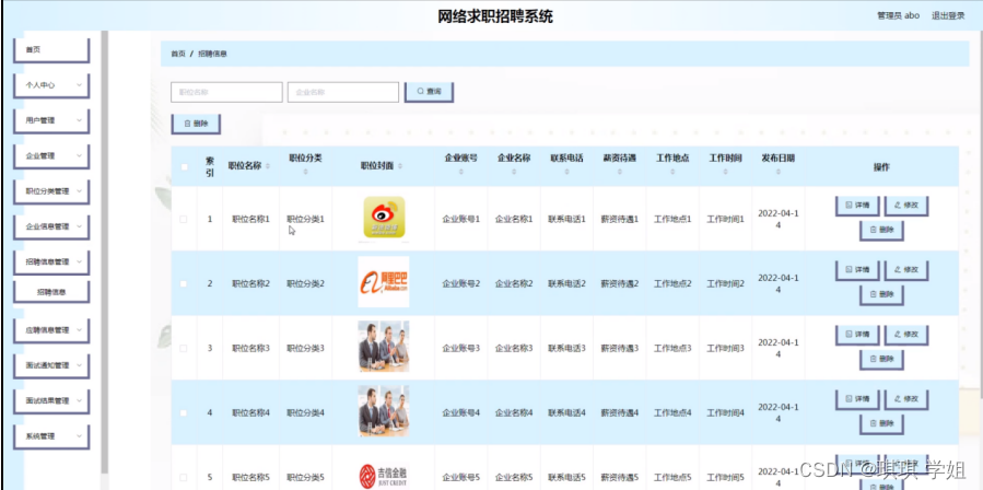 招聘信息管理,在招聘信息管理页面可以对索引、职位名称、职位分类、职位封面、企业账号、企业名称、联系电话、薪资待遇、工作地点、工作时间、发布日期等内容进行详情,修改和删除等操作,如图5-11所示。