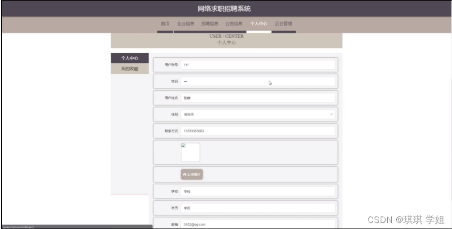 个人中心,在个人中心页面通过填写用户账号、密码、用户姓名、性别、联系方式、上传图片、学校、学历、邮箱、年龄等信息进行更新信息,根据需要对我的收藏进行详细操作,如图5-5所示。