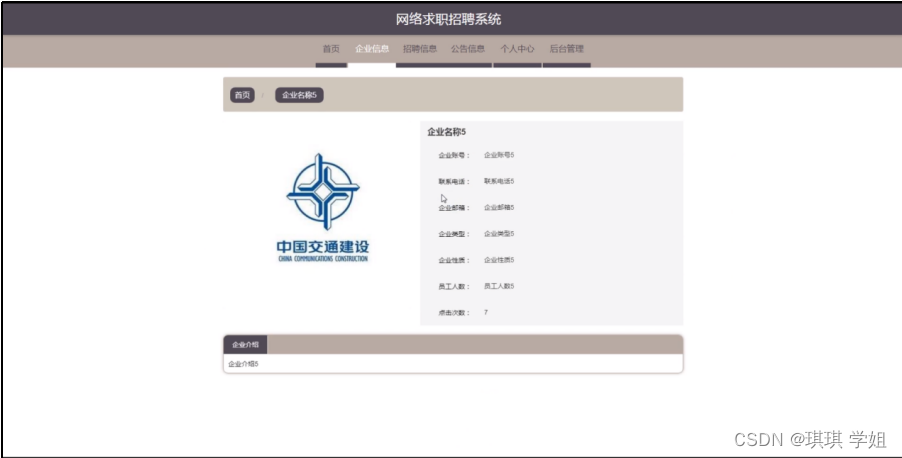 网络求职招聘系统,在系统首页可以查看首页,企业信息,招聘信息,公告信息,个人中心,后台管理等内容进行详细操作,如图5-1所示。