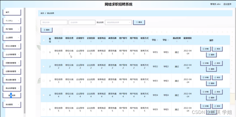 面试结果管理,在面试结果管理页面可以对索引、职位名称、职位分类、企业账号、企业名称、联系电话、薪资待遇、用户账号、用户姓名、联系方式、学历、学校、面试结果、就业时间等内容进行详情,修改和删除等操作,如图5-12所示。