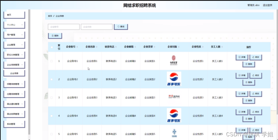 企业信息管理,在企业信息管理页面可以对索引、企业账号、企业名称、联系电话、企业邮箱、企业类型、企业封面、企业性质、员工人数等内容进行详情,修改或删除等操作,如图5-10所示。