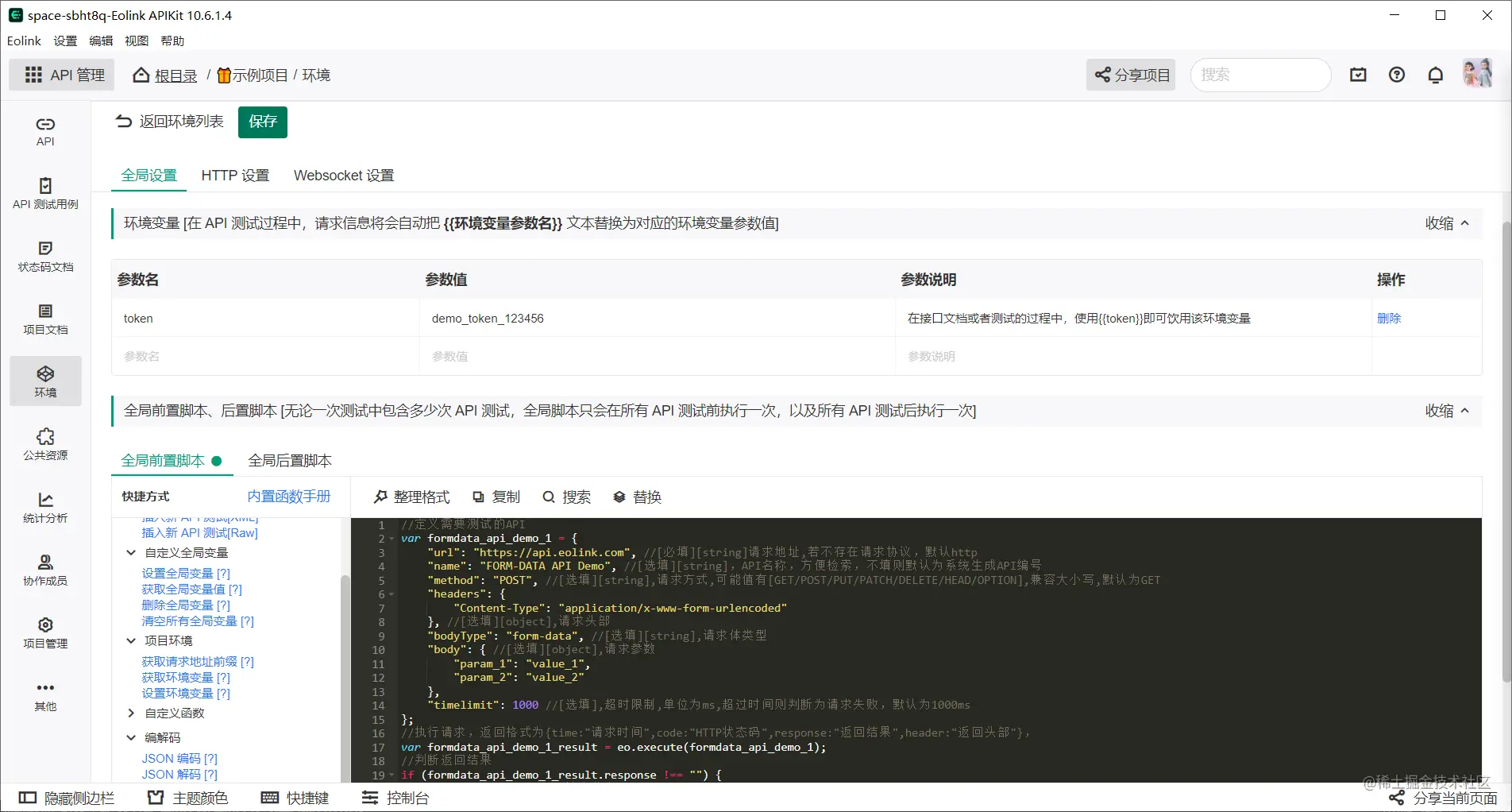 进入到首页面后,我们会看到Eolink精心为我们准备的一个实例项目。从左侧栏目可以看出,Eolink有API文档管理,API测试,API报表,API搭建项目环境,自动化测试等各种功能,接下来慢慢展示。