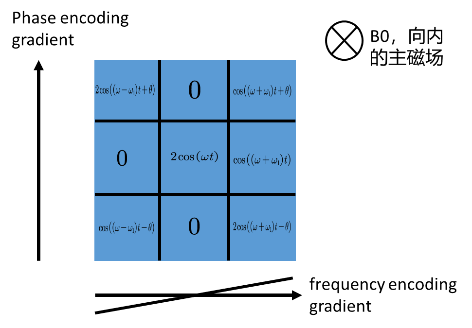frequency encoding gradient同样改变了\omega,并且与收取信号同时进行,就此完成了区块的空间定位。通俗的来说,假设这些区块在一个环形的跑道进行赛跑,Phase encoding gradient就相当于在跑步开始之前,将同一个跑道上的每个跑者推到不同的起点上,frequency encoding gradient相当于使得不同跑道上的跑者有不同的跑步速度。