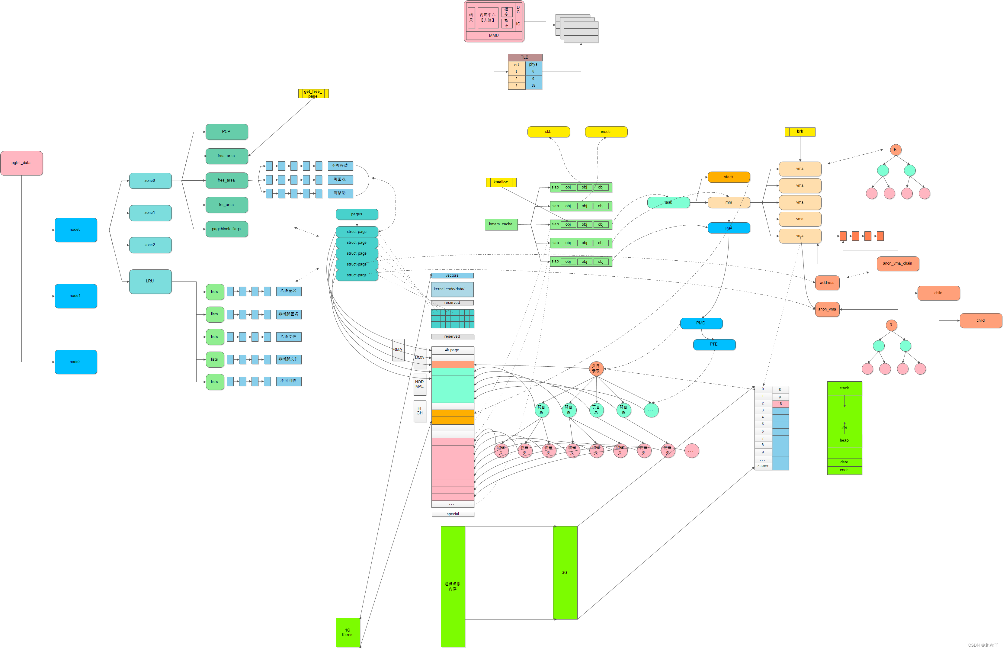 最近,就因为上述原因,整理了下之前了解的Linux内存相关的结构关系,将它们放在一起,以期能有一个初步的全局的视图。姑且就叫做大蓝图吧。不过这个蓝图还不够详细,省略了很多结构细节。记得之前学习计算机网络时,见过一个汇总各种协议的文档,可以不断放大,然后不断显现更多细节的信息。缩小时,细节又被收缩起来,从而展示更加全局的关系。做这个大蓝图的最终目标也如上述协议蓝图,可大可小,可全可细。这里,先开一个头,记录一下,后面边学边补充,这其中可能还夹杂有问题,欢迎大家指正。