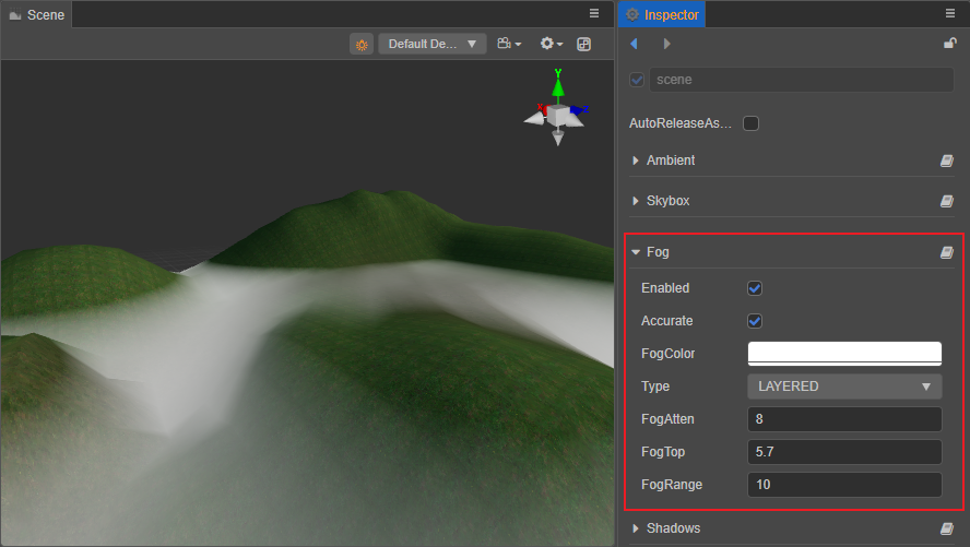 层雾(Layered)平行于水平面,具有一定的高度。可在场景世界坐标系垂直方向上的任一位置设定层雾的顶部,以此来确定雾的高低。