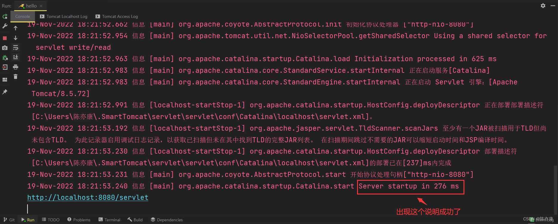 这里标红不要害怕,不是报错,Tomcat的日志信息就是这样的颜色,看到startup in xxxms就表示成功了;