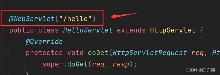 表示当GET请求并且url里的路径是/hello请求的时候,Tomcat才会调用到这里的doGet方法;所以我们在请求中写不同的路径,就会关联上不同的类,也就会执行不同的方法;