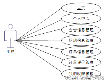 (2)用户:主页、个人中心、公告信息管理、场地信息管理、订单信息管理、订单评价管理、我的收藏管理等功能,用户如图3-2所示。