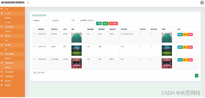 场地信息管理,在场地信息管理页面中可以查看场地编号、场地名称、分类、图片、场地位置、场地视频、场地状态、可约时间、可约时长、预约价格、详情等内容,并且根据需要对已有场地信息管理进行添加,修改或删除等详细操作,如图5-10所示。