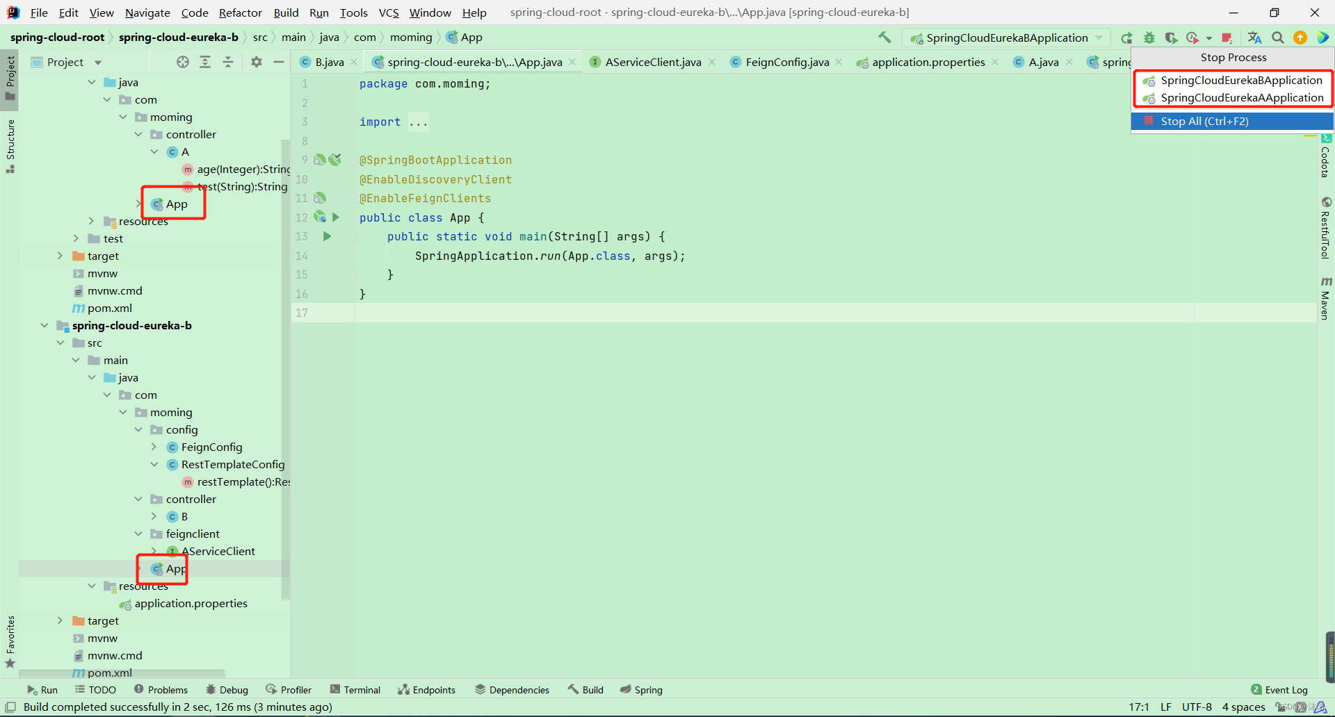 @SpringBootApplication @EnableDiscoveryClient @EnableFeignClients public class App { public static void main(String[] args) { SpringApplication.run(App.class, args); } }写接口使用@FeignClient注解调用a服务,并添加A的抽象方法接口