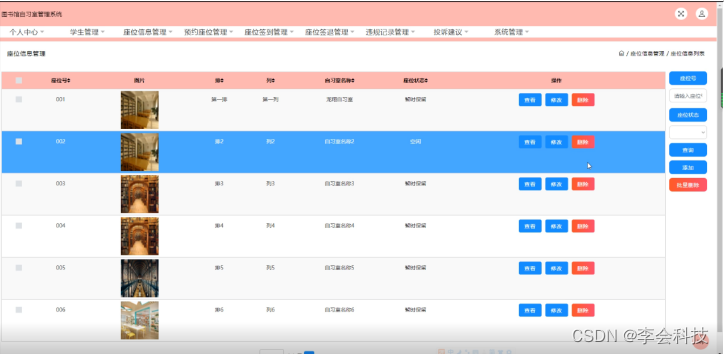 座位信息管理,在座位信息管理页面可以对座位号,图片,排,列,自习室名称,座位状态等信息进行查看,修改和删除操作,如图5-9所示。