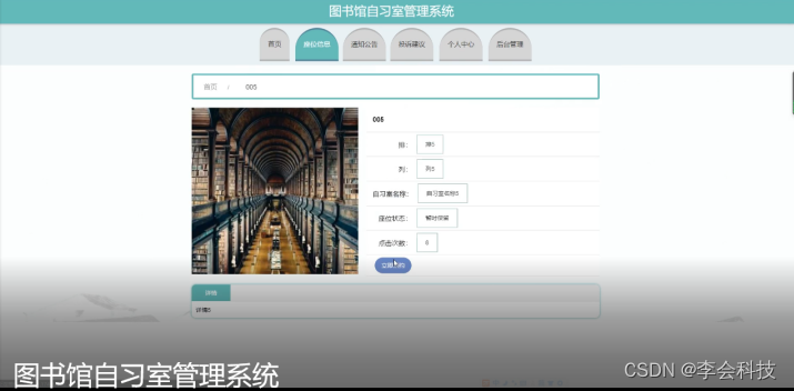 前台功能:学生进入系统可以实现首页,座位信息,通知公告,投诉建议,个人中心,后台管理等功能进行操作;