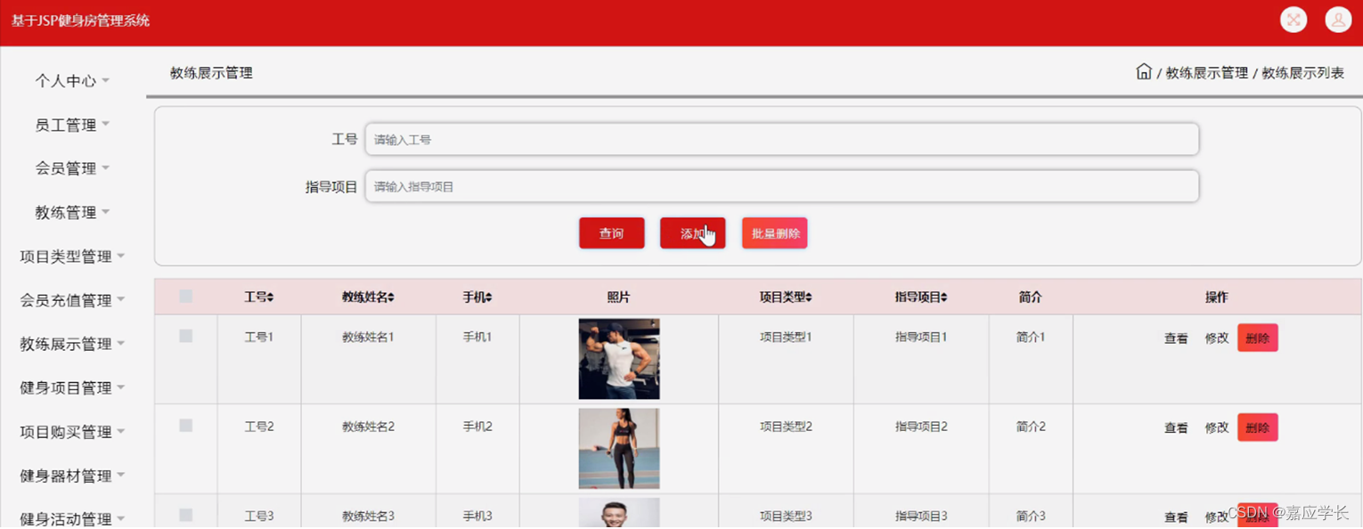 教练展示管理,管理员可在教练展示管理页面查看工号、教练姓名、手机、照片、项目类型、指导项目、简介等内容,还可进行添加、修改或删除等操作,如图5-8所示。