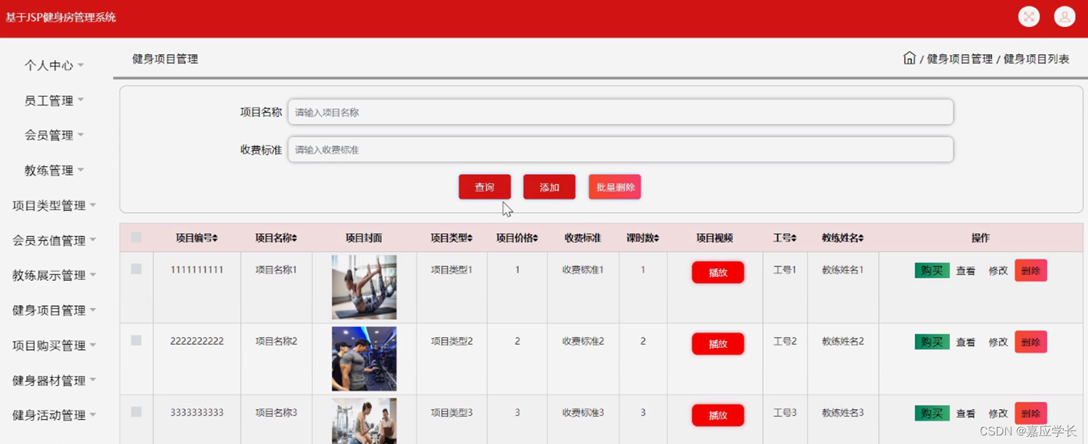 健身项目管理,管理员可在健身项目管理页面查看项目编号、项目名称、项目封面、项目类型、项目价格、收费标准、课时数、项目视频、工号、教练姓名等内容,还可进行添加、修改或删除等操作,如图5-9所示。