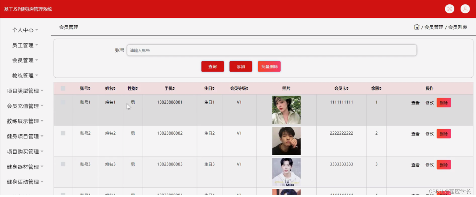 会员管理,管理员可在会员管理页面查看账号、姓名、性别、手机、生日、会员等级、照片、会员卡、余额等内容,还可进行添加、修改或删除等操作,如图5-4所示。