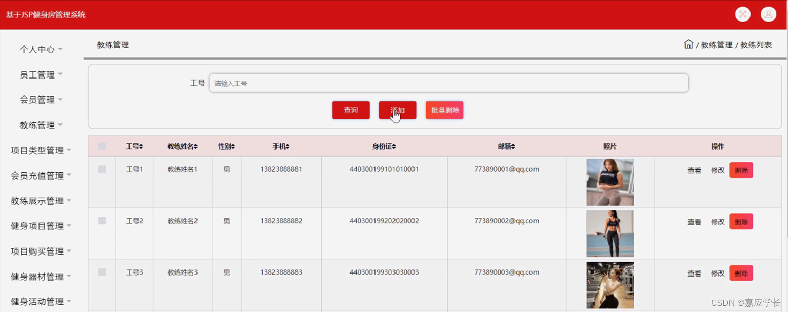 教练管理,管理员可在教练管理页面查看工号、教练姓名、性别、手机、身份证、邮箱、照片等内容,还可进行添加、修改或删除等操作,如图5-5所示。