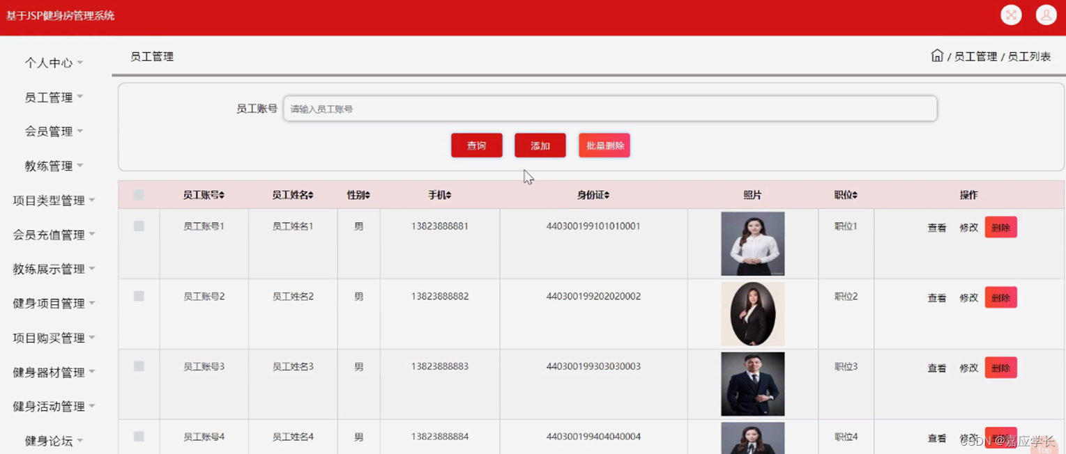 员工管理,管理员可在员工管理页面查看员工账号、员工姓名、性别、手机、身份证、照片、职位等内容,还可进行添加、修改或删除等操作,如图5-3所示。