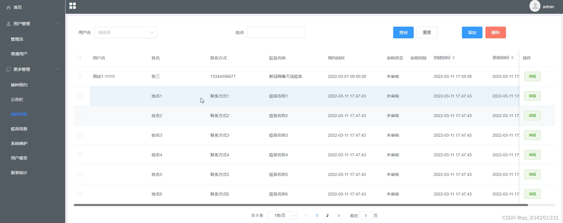 在接种信息页面可以查看索引、用户名、姓名、联系方式、疫苗名称、预约时间、等信息,并可根据需要进行修改或删除等操作